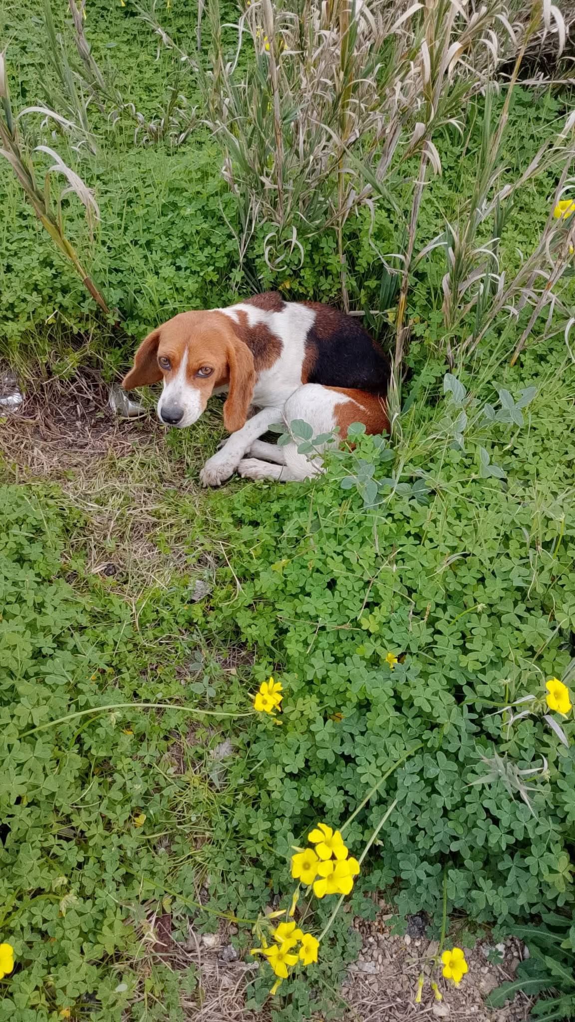 È stata ritrovata immobile a bordo strada, terrorizzata dalle auto che le sfrecciavano accanto, senza forze per alzarsi e camminare. Molto probabilmente è uno scarto di cacciatori. Ha paura degli estranei e si schiaccia quando ci si avvicina, soprattutto con gli uomini, ma è dolce e fiduciosa con chi conosce.
